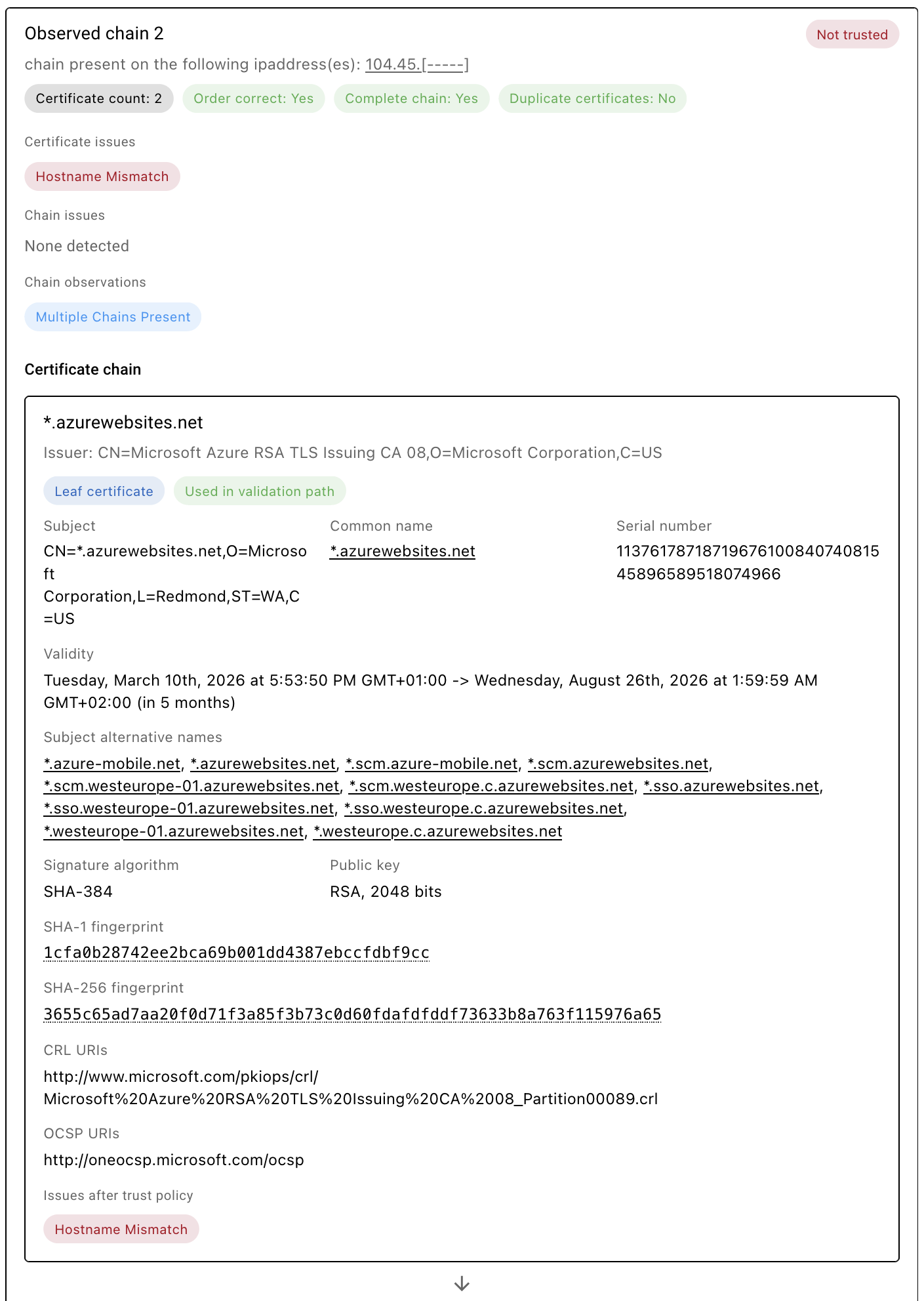 - Op welke IP-adressen welke certificaten zijn ontvangen (een domein heeft vaak meerdere IP-adressen om de bezoekersaantallen te verspreiden over meerdere servers. Sommige sites leveren per IP een andere set met certificaten; vaak is dat een onjuiste configuratie, maar het is niet per definitie fout.)
