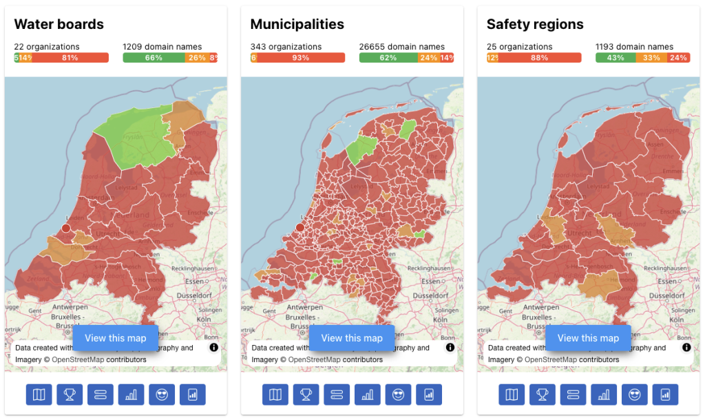 Op de onderstaande schermafbeeldingen is een tussentijdse versie te zien van de kaarten van Nederlandse provincies en gemeenten. Deze is gehaald van SecurityBaseline.eu en is al openbaar te bekijken omdat nagenoeg alles op orde is.